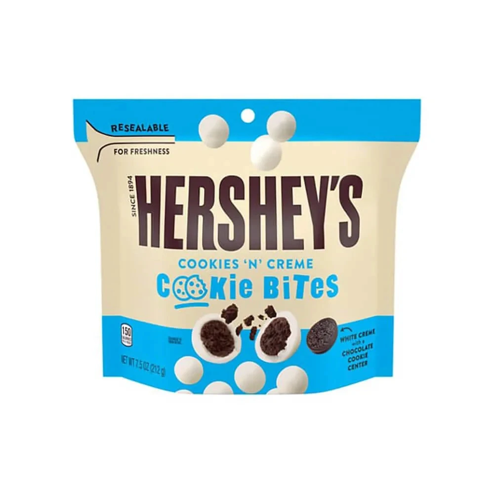 Resealable bag contains 7.5 ounces of Hershey’s Cookies n Creme Cookie Bites Candy.