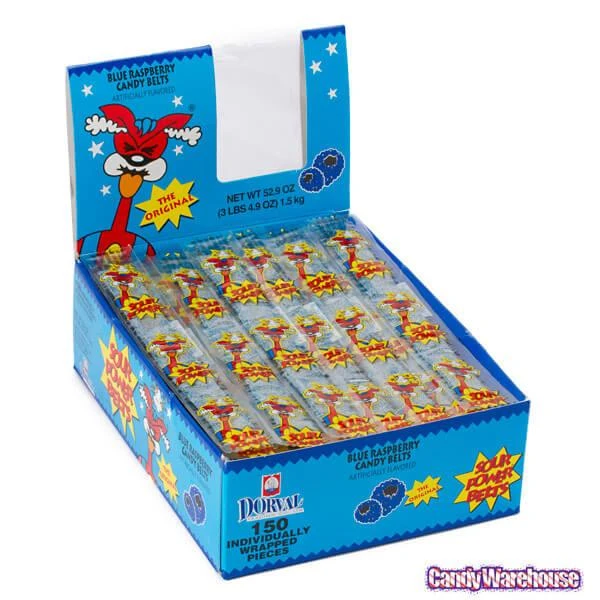 Display box contains 150 wrapped Blue Raspberry Sour Power Candy Belts.